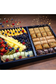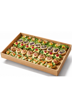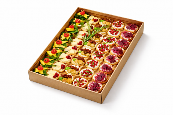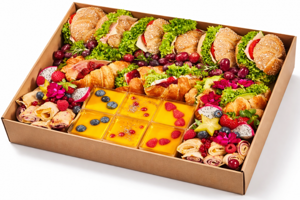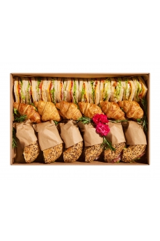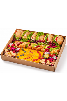 Składniki: minimuffin czekoladowy, mini wstążka czekoladowa, ślimak z czerwoną porzeczką, ślimak z cynamonem, mini ciasteczko z wiśnią, mini serniczek, mini okular orzechowy, mini croissant z czekolada, mini croissant z malina, winogrono jasne, winogrono ciemne, porzeczka czerwona, borówka, mięta świeża, kwiaty do dekoracji. 0 215.00