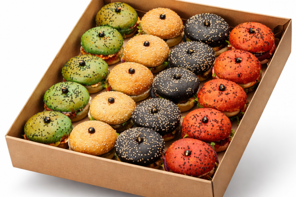 5x Czerwony burger: pieczony burak, ser kozi, rukola, karmelizowana cebula czerwona, domowy sos czosnkowy na bazie majonezu, bułka pszenna, sezam.